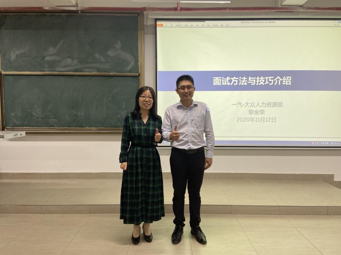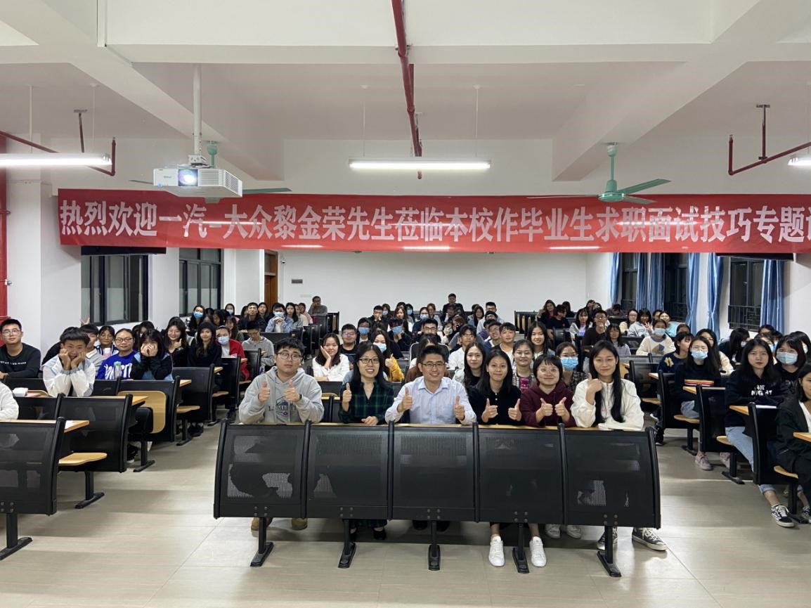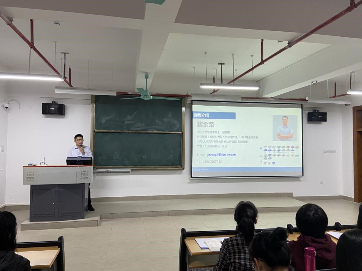 工商管理学院于11月12日晚在13—501有幸邀请到一汽-大众汽车有限公司佛山分公司经理黎金荣先生为我院人资毕业生等举行一场关于面试方法与技巧的专题讲座。我院常务副院长胡高喜院长、人力资源管理系主任刘琰老师、17级人力资源管理专业全体学生、18级人力资源管理2班、20级人力资源管理专业部分学生代表参加了此次讲座,本次讲座由17人资1班黎岳镔同学主持。