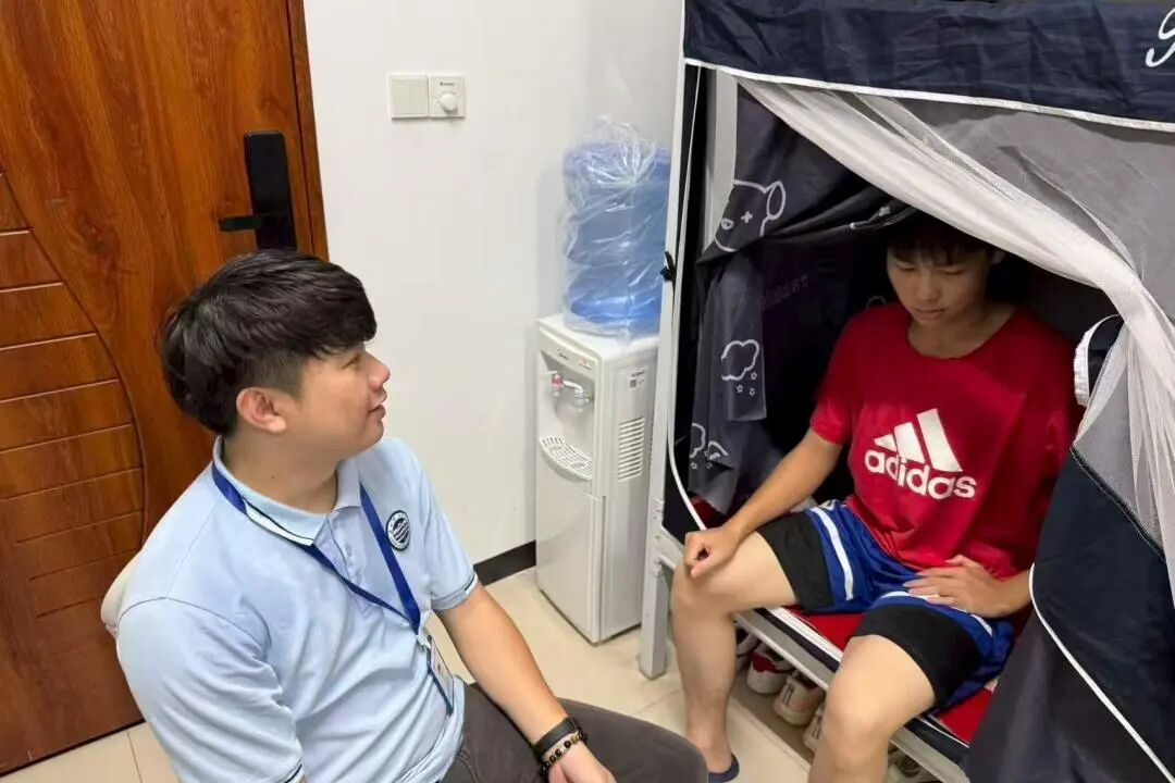 在温馨的灯光下,黄老师注意到的下铺同学一直沉默不语。他自然地坐到床边,轻声问道:"第一次住校还习惯吗?"学生小声说:"想家,也担心和新同学处不好。"黄老师笑着拍拍他的肩:"我大一那年也是这样,舍不得爸妈,但是后面发现我的舍友和同学们都很好,和他们玩的都很开心,然后自己也会去参加一些社团,发展自己的兴趣爱好,慢慢就喜欢上了大学生活,你可以的相信自己,你是个男子汉。"