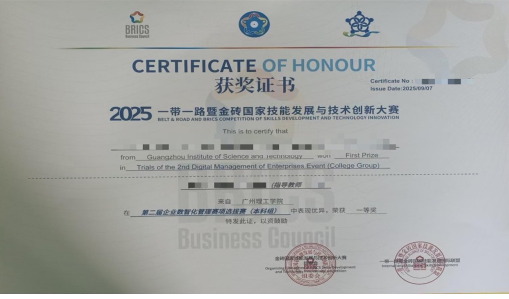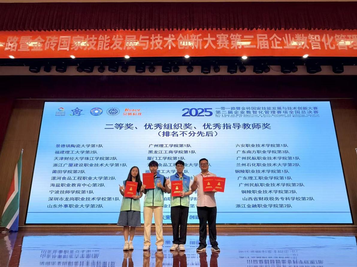 由胡丽美、陈健诚、尹乔烽三位同学组成的“广理砺锋剑”队在苗增老师指导带领下奔赴赛场,团队凭借着扎实的数据分析能力,出色的决策运营水平和默契的团队协作竞赛,最终斩获全国总决赛二等奖(银牌),指导老师苗增获评“优秀指导教师”,学校荣膺“优秀组织奖”。这三项荣誉,既是对师生团队卓越表现与辛勤付出的直接肯定,也是对学校在组织保障与人才培养方面扎实工作的充分认可。