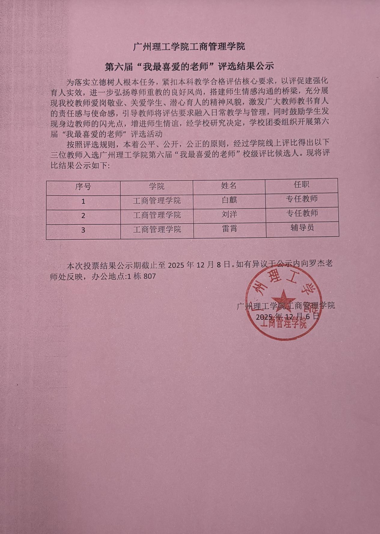 本次“我最喜爱的老师”专任教师评选活动中,白麒老师以及刘洋老师当选本次工商管理学院“我最喜爱的老师”。