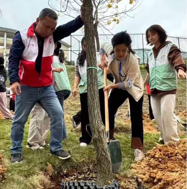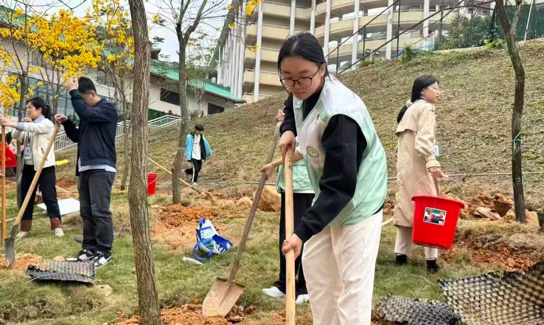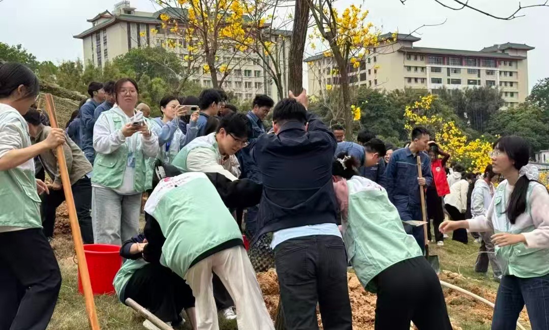 在教师示范带动下,同学们迅速行动、分组协作,或掘土挖坑,或扶苗定植,或培土浇水,各环节紧密衔接、井然有序。尽管泥土沾满鞋裤、汗水浸湿衣衫,大家依然乐此不疲,现场洋溢着青春昂扬的劳动热情。经过一番辛勤忙碌,一株株新苗迎风挺立,也在同学们心中播下绿色发展的种子。