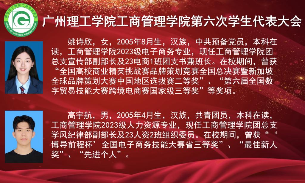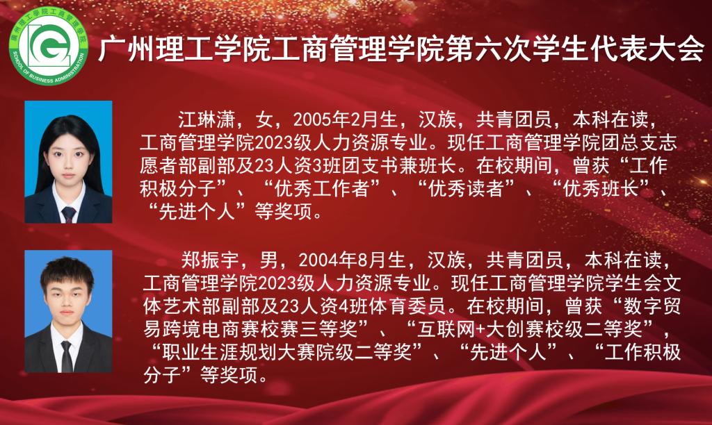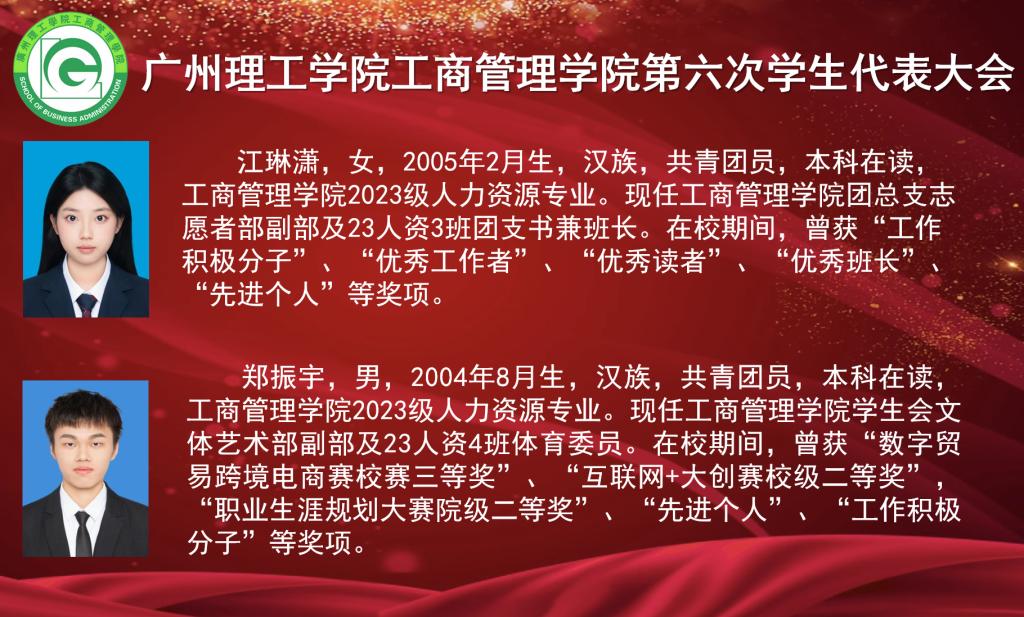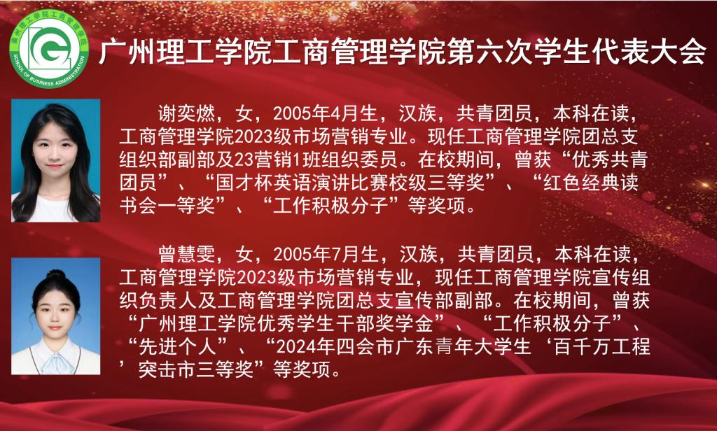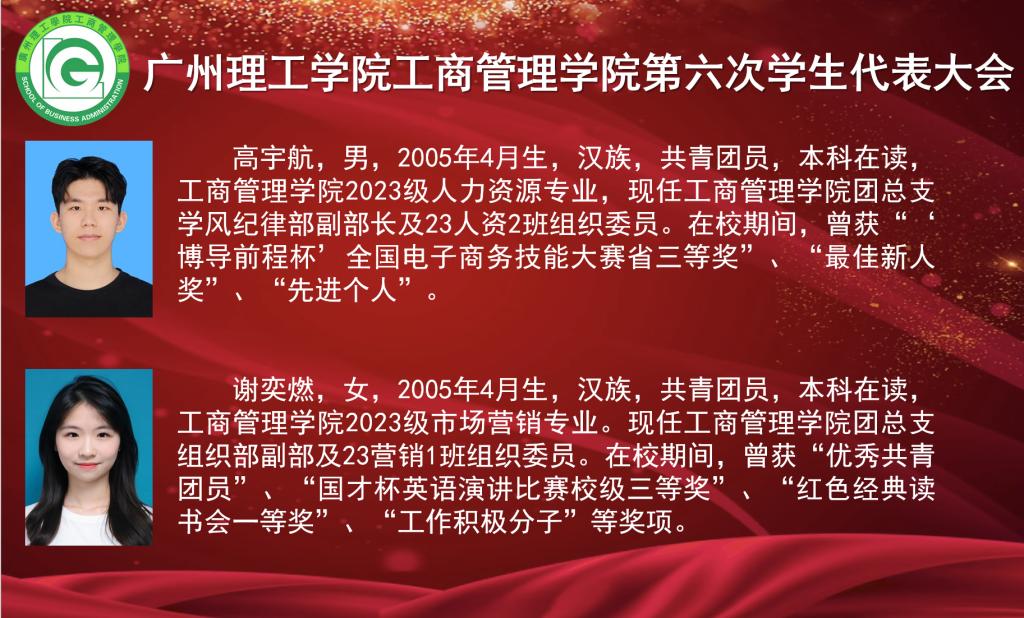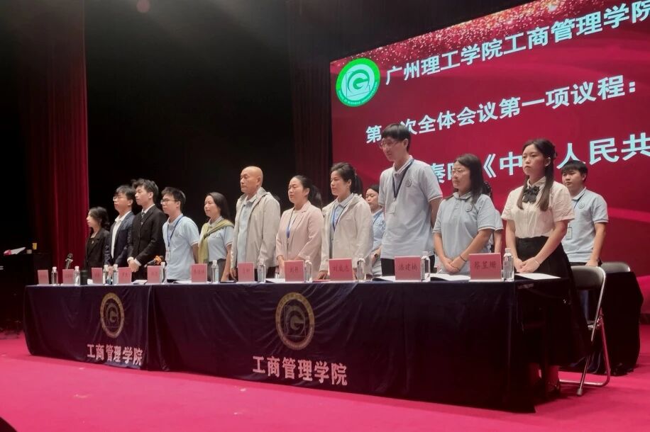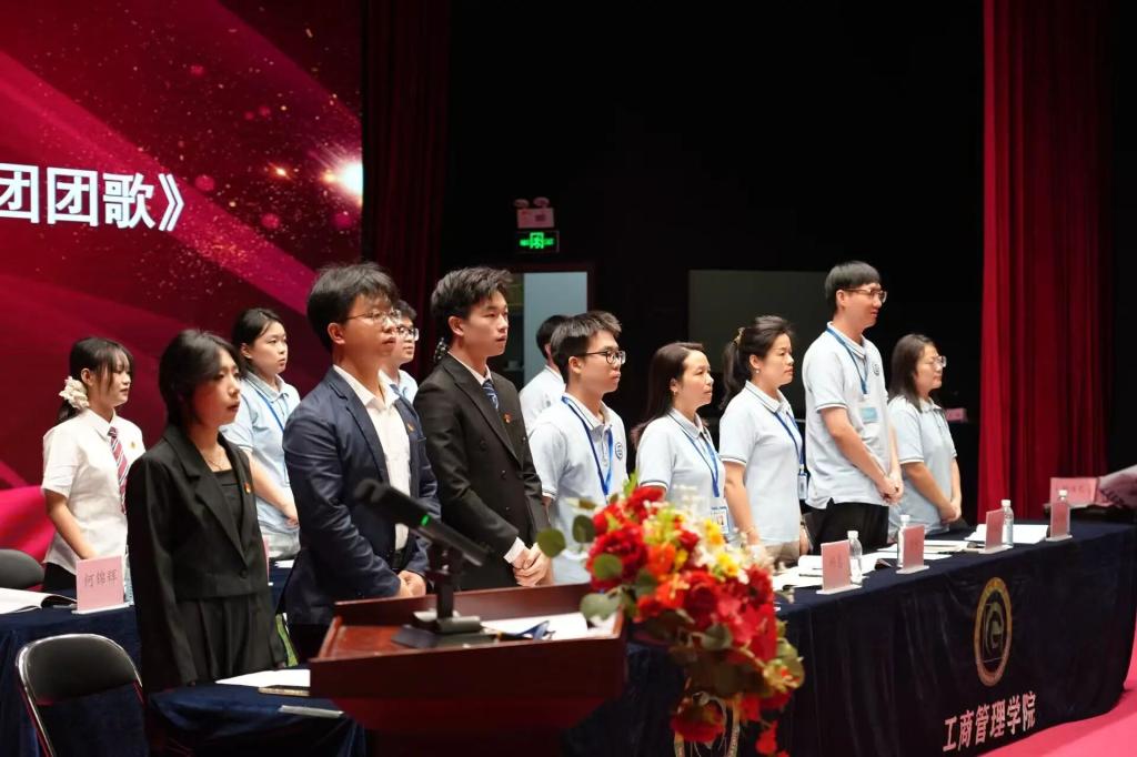 本次大会出席的嘉宾有校团委副书记肖柳,工商管理学院院长李培祥,工商管理学院党总支书记杨惠,工商管理学院团总支书记罗杰,工商管理学院学工办主任刘丹,工商管理学院党总支组织员、学生党支部书记刘威志,工商管理学院教师潘建楠,工商管理学院辅导员雷霄、兰凌玉、廖婉余、黄大锋,广州理工学院学生会执行主席蔡旻珊,工商管理学院第五届学生会执行主席兼团总支副书记温灏晖,工商管理学院第五届学生会执行主席黄梓桁、侯健,工商管理学院第五届团总支组织委员姚潇虹,工商管理学院第五届团总支宣传委员何锦辉。大会由工商管理学院团总支书记罗杰主持并宣布大会正式开始。