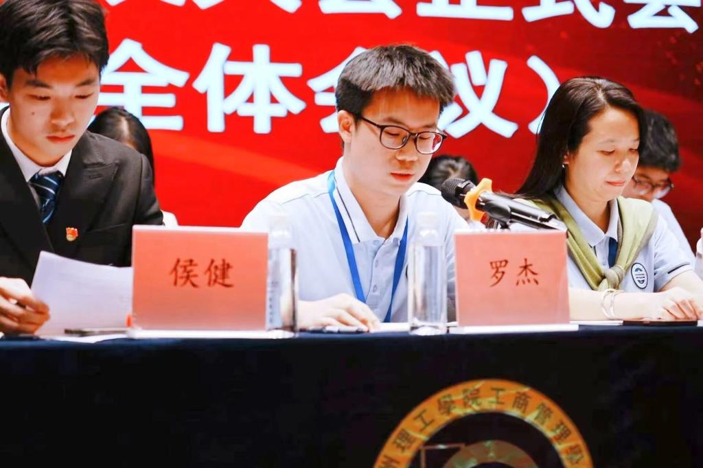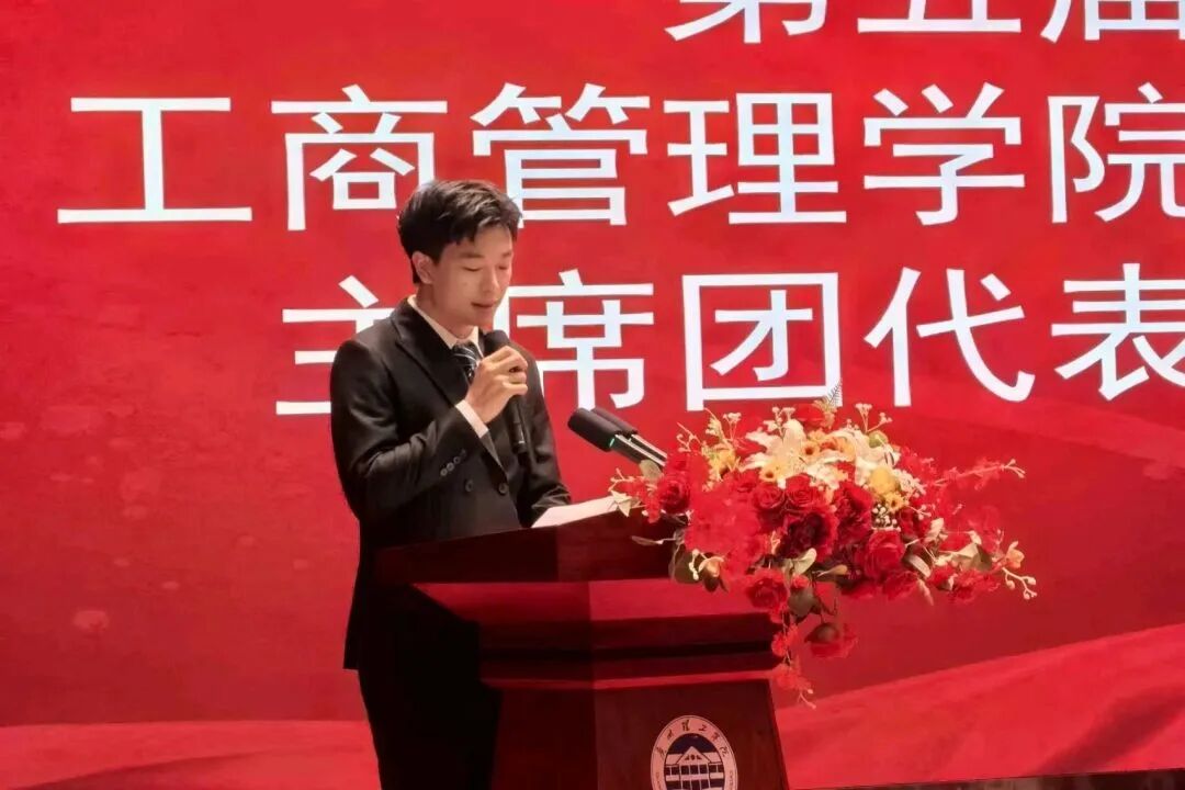 工商管理学院第五届学生会执行主席侯健代表大会作分团学习与讨论报告。