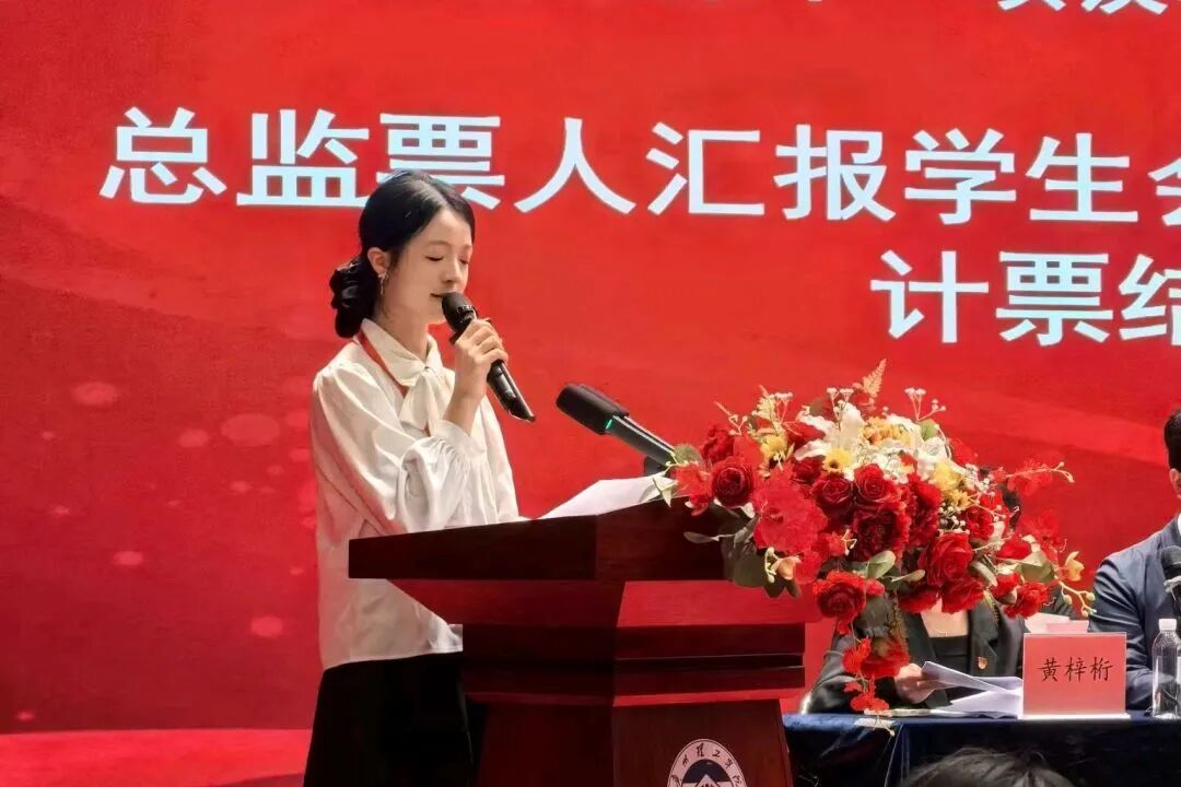 总监票人王诗琦汇报学生会主席团选举计票结果。