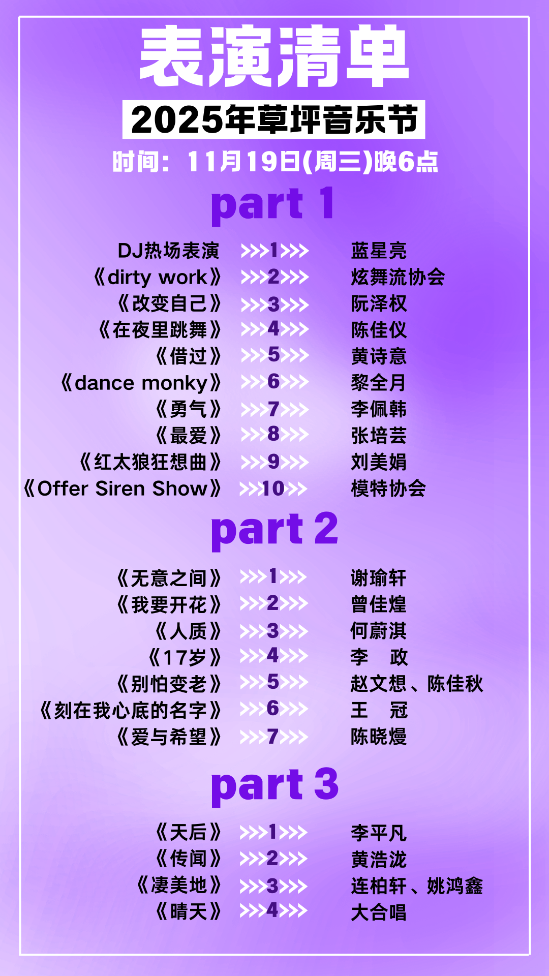 (向博文)11月19日(周三)18:00由工商管理学院牵头主办,携手艺术设计学院、新能源汽车与现代航空学院、经济管理学院举办的校园草坪音乐节即将火热开幕,详细节目单新鲜出炉!