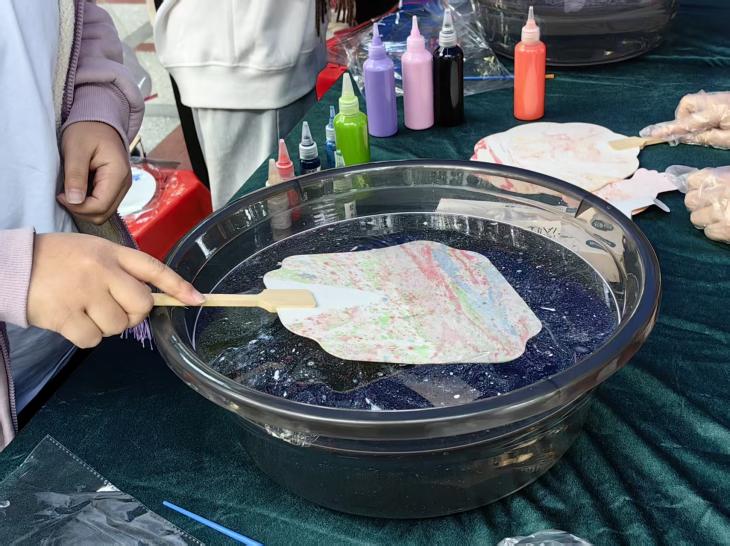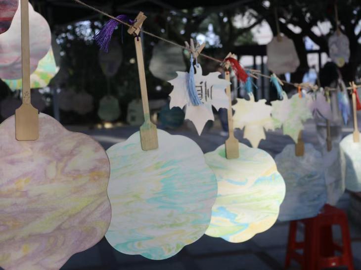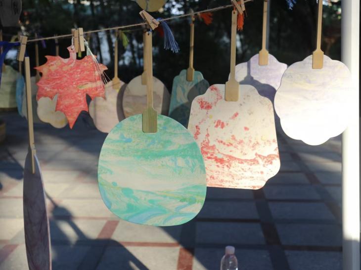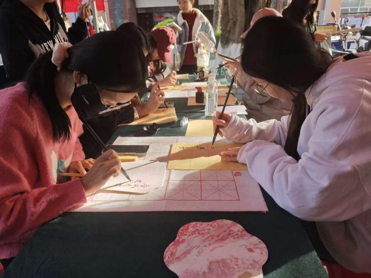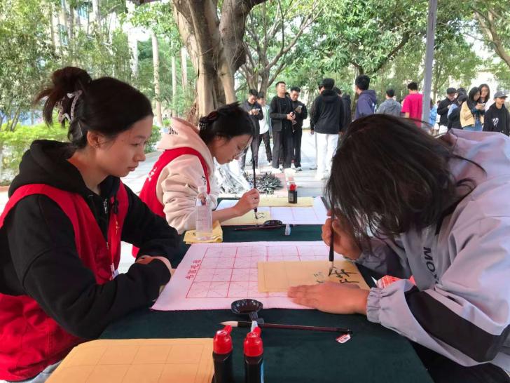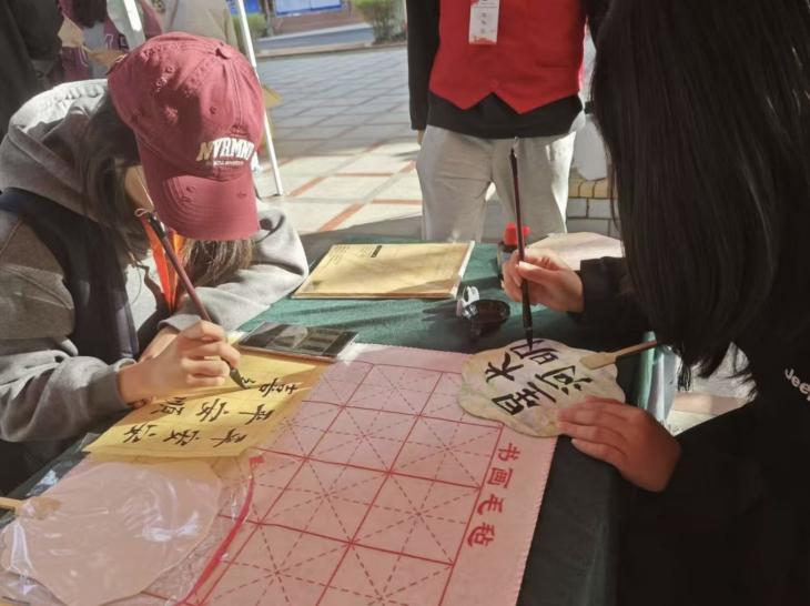 笔墨创作区同样精彩纷呈。师生们拿起毛笔,在扇面上书写诗词,楷书工整规范,行书流畅自然。工作人员全程提供指导,解答大家在毛笔使用、墨汁调配等方面的疑问,师生们相互交流创作经验,现场氛围和谐融洽。