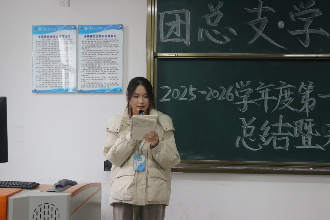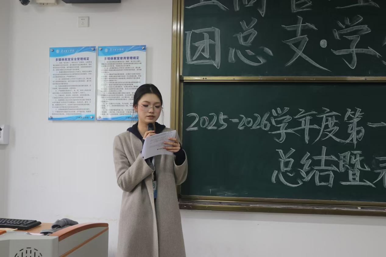 团总支学风纪律部副部长苏佩伶对部门本学期的工作进行汇报。学风纪律部本学期稳步推进部门建设与学风督查工作,顺利完成干事培养、宿舍检查及彩旗队培训等多项任务,为学院大型活动的顺利开展提供支持。未来,学风纪律部将持续加强内部技能培训,优化协作机制,不断提升工作效能,为营造优良学风、服务学院发展贡献力量。