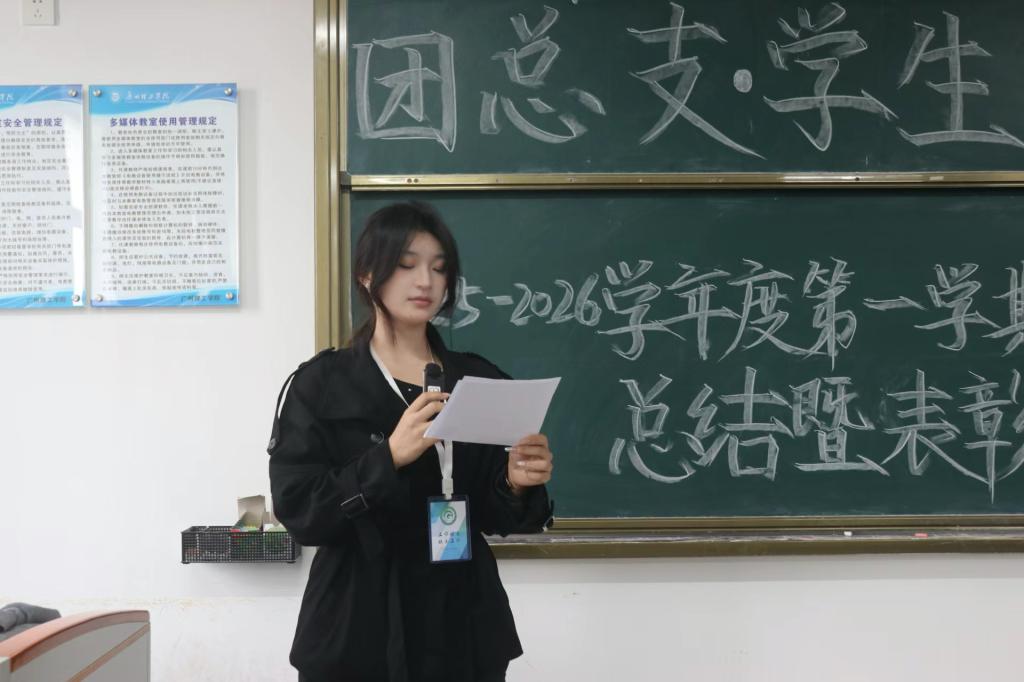 各部门代表依次上台,就过去一学期的工作成果进行总结发言。团总支组织部副部长温芸芸代表部门对工作情况进行总结。组织部稳步推进各项团务工作,先后完成团费收缴、团支部考核、团籍整理及新生团籍收集等基础任务;组织开展新生团支书培训,严谨审核入团积极分子档案,同时策划主题团日、彩虹跑等活动,有效凝聚团员力量。下一步,部门将优化与改进开展工作,持续夯实学院团组织建设的根基。