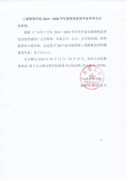 根据《广州理工学院2019—2020学年奖学金实施细则及评比办法的通知》文件精神,本着公平、公正、公开的原则,经学院评审小组审核,决定授予2017级市场营销1班陈秋仪同学国家奖学金,现予以公示。