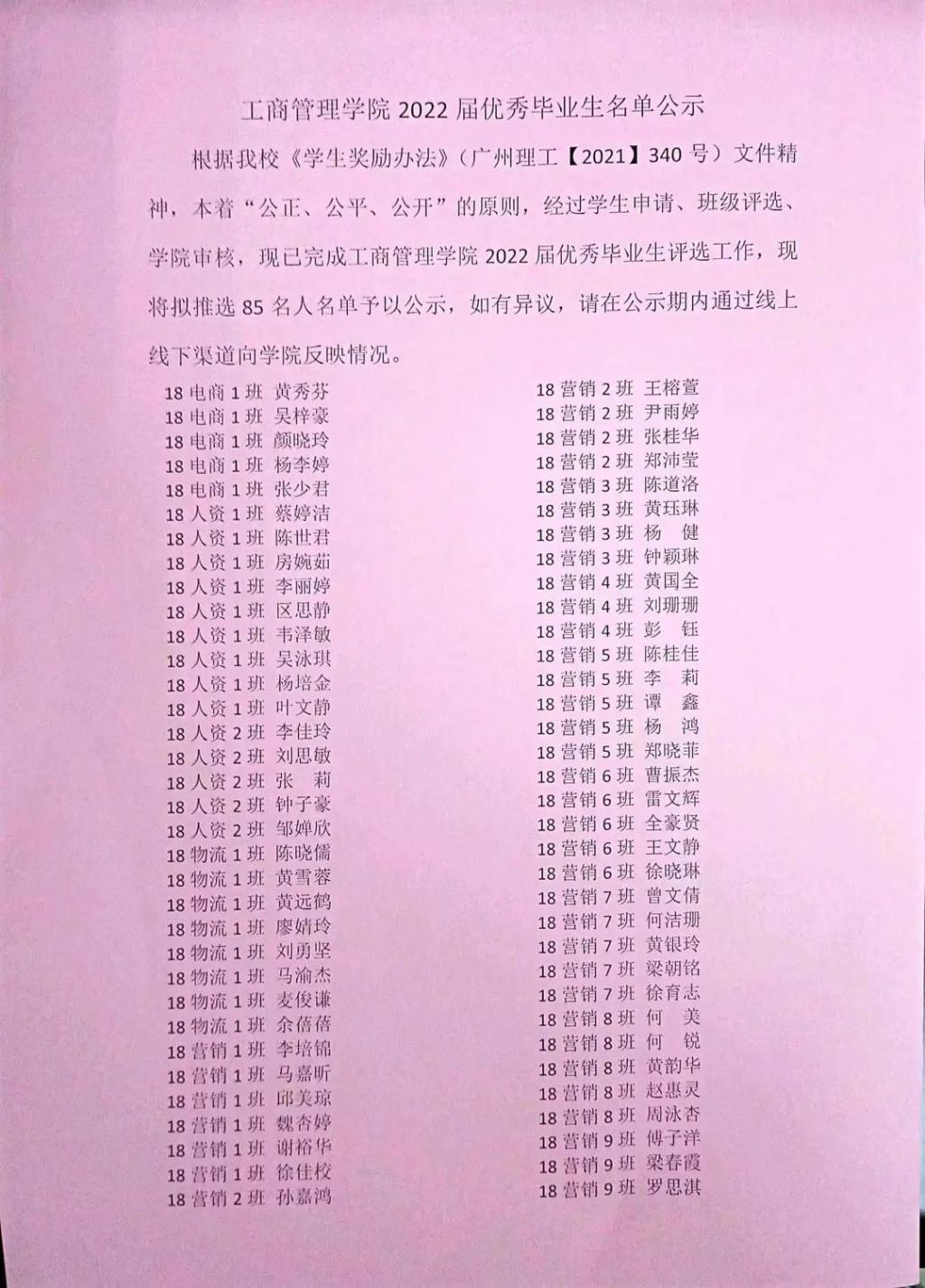 根据我校《学生奖励办法》(广州理工【2021】340号)文件精神,本着“公正、公平、公开”的原则,经过学生申请、班级评选、学院审核,现已完成工商管理学院2022届优秀毕业生评选工作,现将拟推选85名人名单予以公示,如有异议,请在公示期内通过线上线下渠道向学院反映情况。