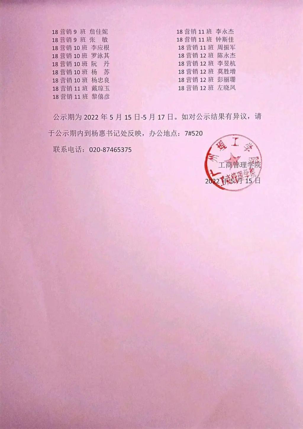 公示期为2022年5月15日-5月17日。如对公示结果有异议,请于公示期内到杨惠书记处反映,办公地点:7#520,联系电话:020-87465375