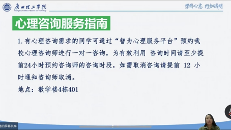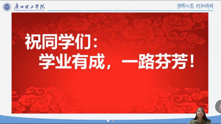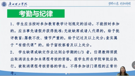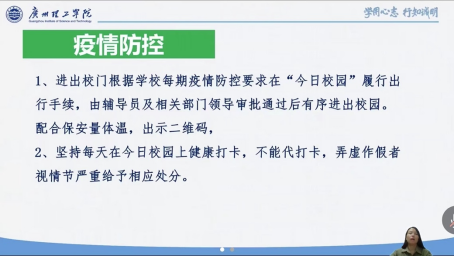 杨惠书记在会议上依据《广州理工学院学生手册》并结合实际为2022级新生讲解了校规校纪教育、校园安全教育、心理健康教育等内容,同时表达了对新同学的热烈欢迎和美好祝愿。