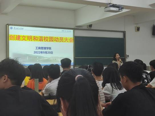 (林泫任)9月20日,为进一步培养学生良好行为规范,营造优良学风和校风,工商管理学院在7栋综合楼517、518分别召开了创建文明校园动员大会,主会场由党总支书记杨惠主持,分会场团总支书记赵丹丹主持。