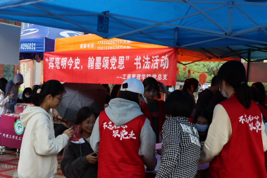(王君萍,蓝晶晶)11月7日,工商管理学院党总支联合长风书法协会在7栋综合楼门前小庭院开展主题为“挥毫明今史,翰墨颂党恩”书法活动,弘扬中国书法文化,激发学生对书法艺术的兴趣和热情,充分展现中国书法的艺术魅力。此次活动对象面对全体师生。