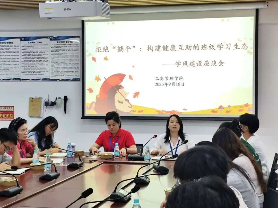 ( 梁培欣,陈碧怡)为进一步加强班级学风建设,激发学生学习动力,构建健康互助的班级学习生态,9月18日,工商管理学院以“拒绝‘躺平’:构建健康互助的班级学习生态”为主题,召开学风建设座谈会。学院党组织书记杨惠、各辅导员、教务员及全体班级班长齐聚一堂,共商学风建设良策。