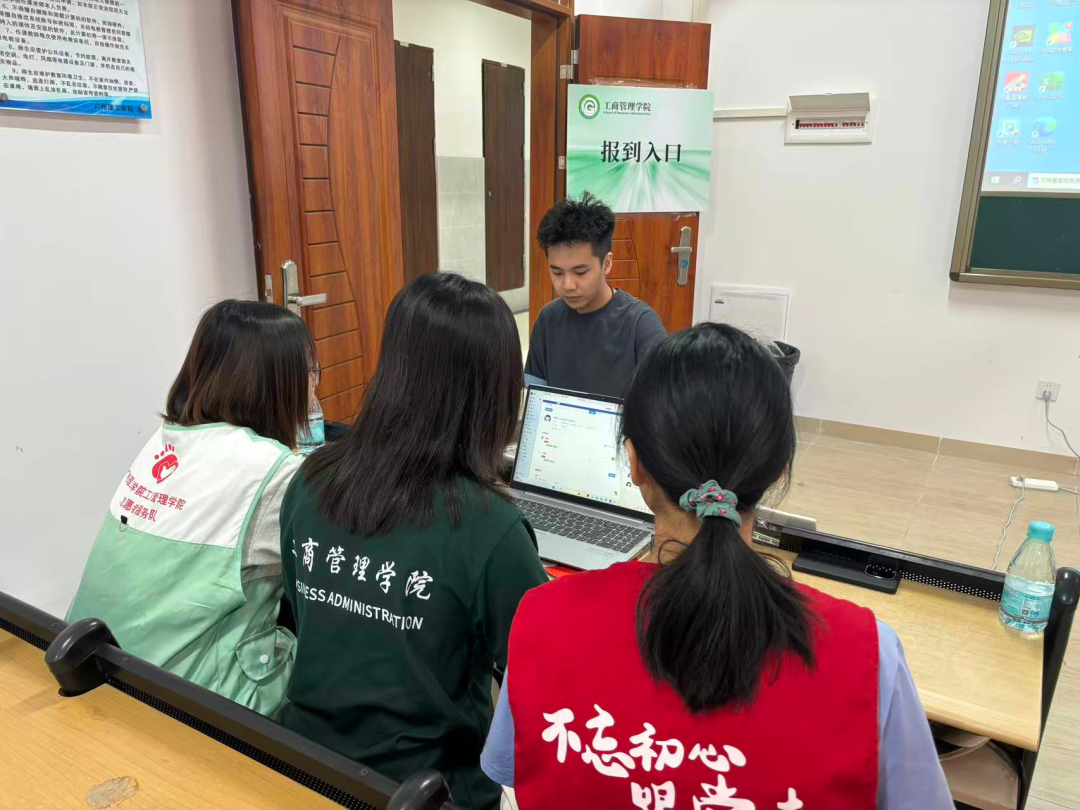 早晨7点,迎新工作准时启动。志愿者们统一着装、分工明确,在校门口、报到处、宿舍区等多个点位提供引导与服务。他们耐心解答疑问、协助搬运行李、指引报到流程,让新同学们在踏入校园的第一时间就感受到工商管理学院大家庭的温暖与关怀。