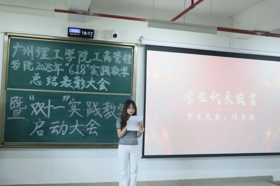 9月18日下午,工商管理学院于13-403室召开广州理工学院工商管理学院&广州一臣科技2025年“618”实践教学总结表彰暨“双十一”实践教学启动大会,由22营销4班郭凯茵同学主持会议。此次大会系统复盘“618”期间实践教学的创新成果与育人实效,双方合作从“项目共建”向“体系共创”深度进阶,进一步完善“以践强能”的人才培养模式,延续为学生搭建从理论学习到职业实战的优良衔接平台,持续夯实校企协同育人的实践根基。