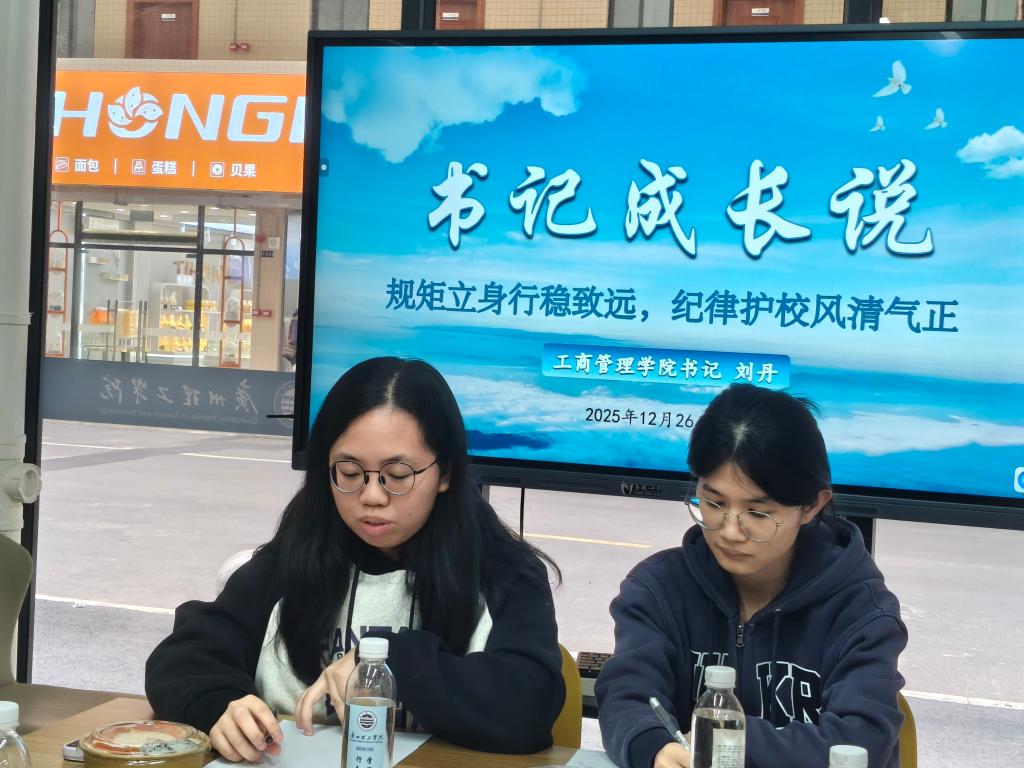 12月26日下午,工商管理学院“书记成长说”活动在第一社区顺利开展,本次活动由刘丹书记主讲,辅导员李经亚老师参加了此次活动。活动以“规矩立身行稳致远,纪律护校风清气正”为主题,紧扣本科教学合格评估要求与学风建设关键痛点,通过师生面对面交流,聚焦问题精准破局,凝聚学风建设共识,为营造优良学习氛围、助力学生全面发展注入动力。