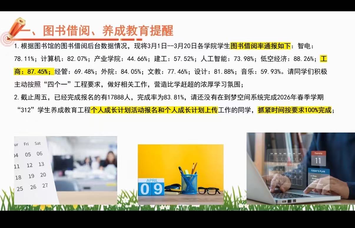 学生处重点强调图书借阅与养成教育工作,我院图书借阅率 87.45%,位列全校前列,同时督促未完成“312”养成教育计划报名的同学尽快完成。班会部署学风督查、评估知识学习、学杂费清缴等工作,要求学生规范仪容仪表,自觉维护校园文明。
