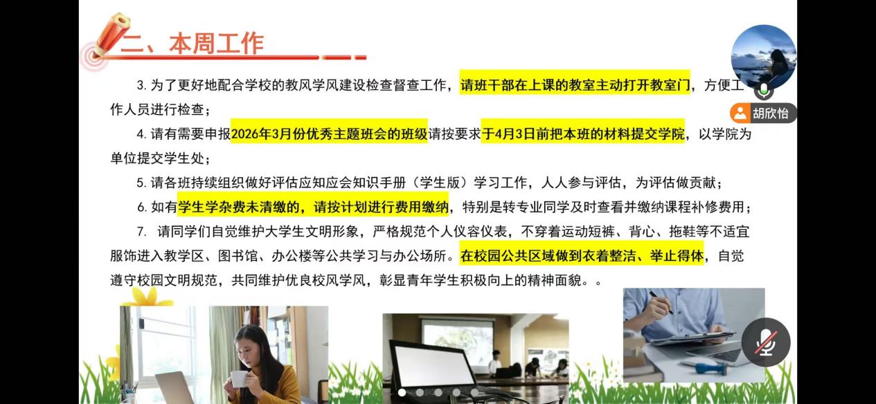 针对宿舍管理,班会提醒清明假期离校需做好水电关闭与贵重物品保管,严禁使用违规电器、宿舍吸烟等行为。学院重申课堂 “三率” 要求,规范请假流程与凭证,明确晚归、熄灯时间及宿舍管理规定。