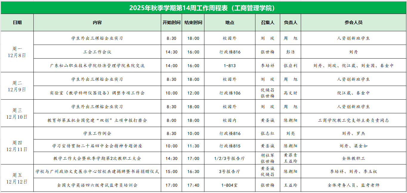 工商管理学院2025年秋季学期第14周工作周程表