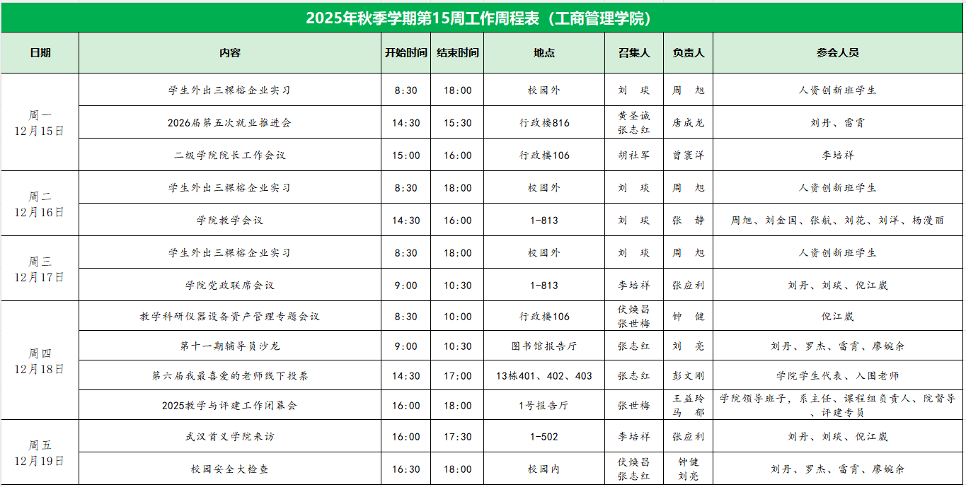 工商管理学院2025年秋季学期第15周工作周程表